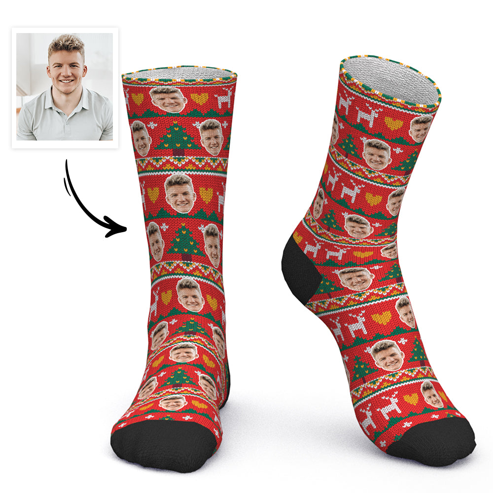 Custom Face Socks Personalized Photo Socks Christmas Gift Santa Socks Christmas Tree - Red