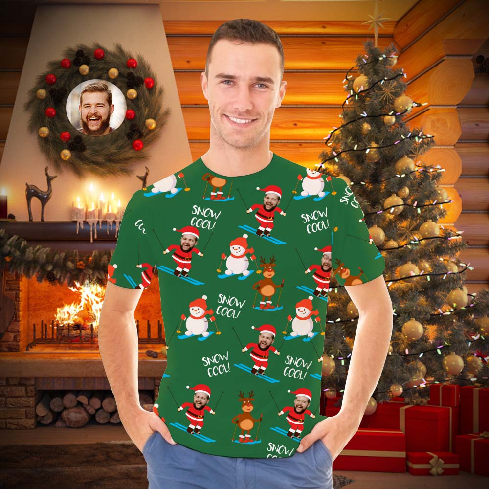 Custom Face Men's T-shirt Personalized Photo Green Santa T-shirt - Snow Cool