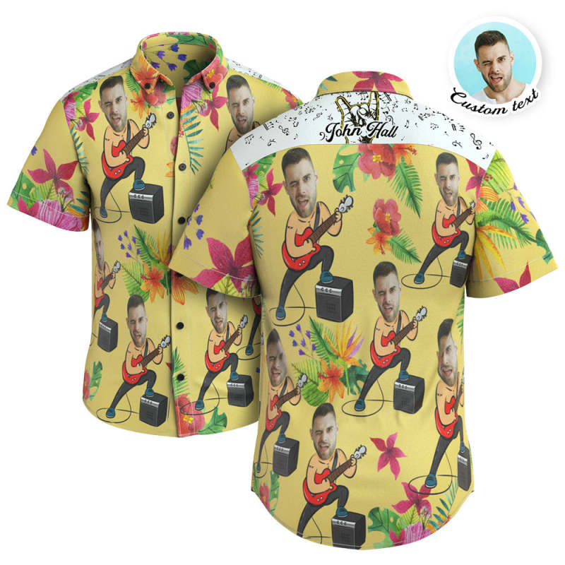 Custom Face And Text Hawaiian Shirt Short Sleeve Shirt Flowers Beach Summer Guitarist Shirts for Men
