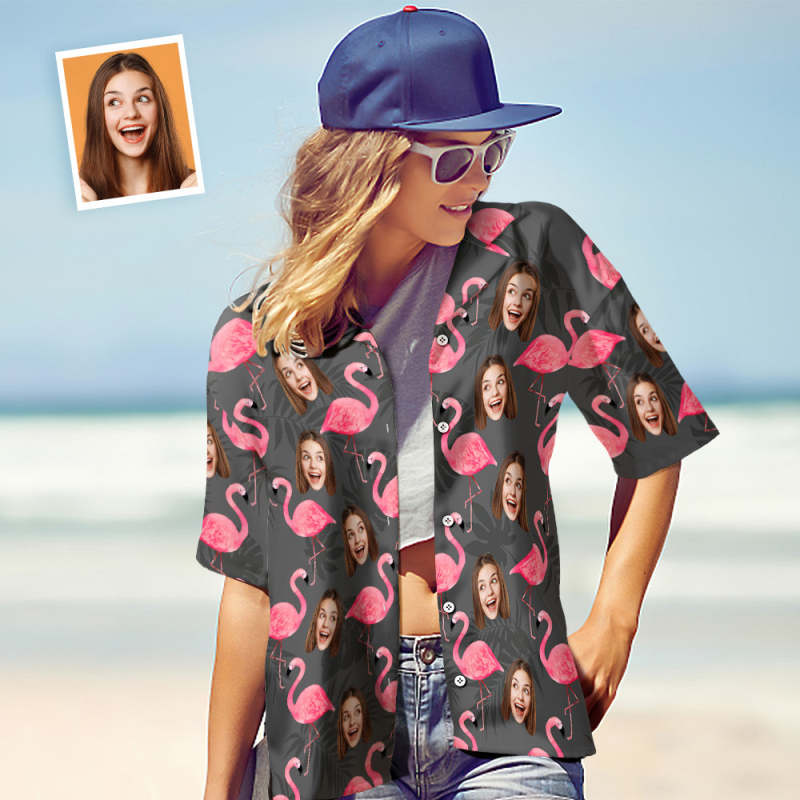 Custom Face Hawaiian Shirt For Her Personalized Women's Photo Shirt Flamingo & Monstera Leaves Valentine's Day Gift