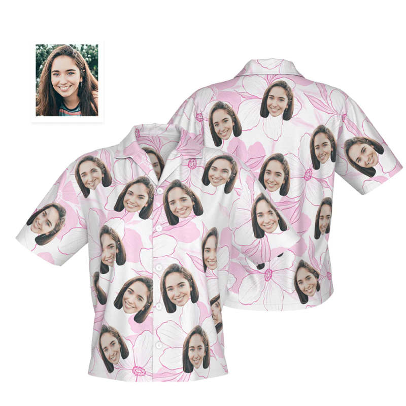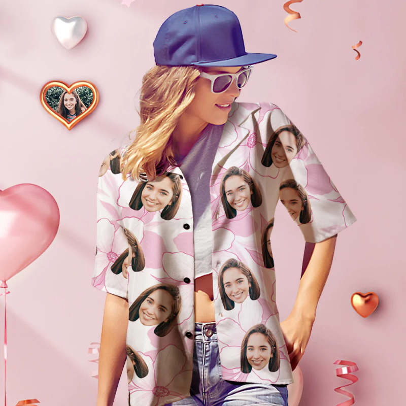 Custom Face Hawaiian Shirt Personalized Women's Photo Shirt Valentine's Day Gift for Her Pink Flower