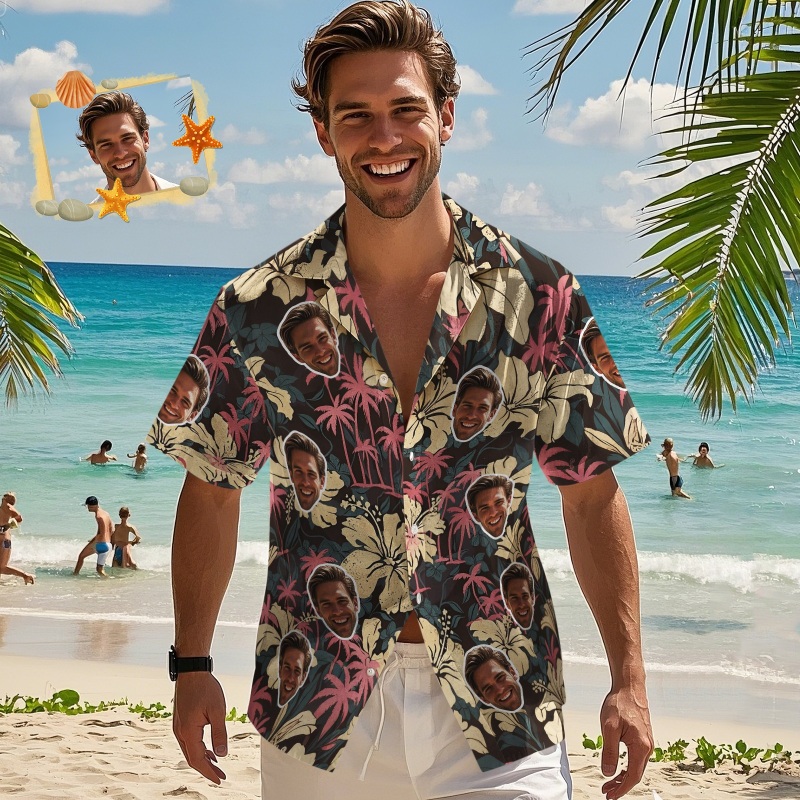 Custom Face Hawaiian Shirts Floral and Pink coconut tree Patterned Shirts Perfect for Summer Vacation Clothes Gifts for Men