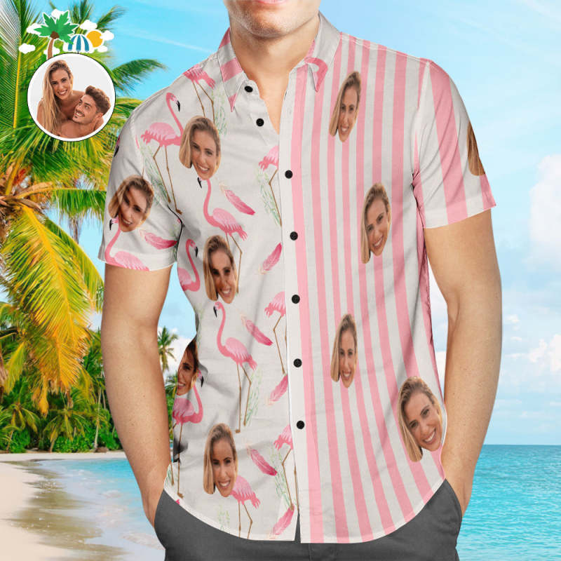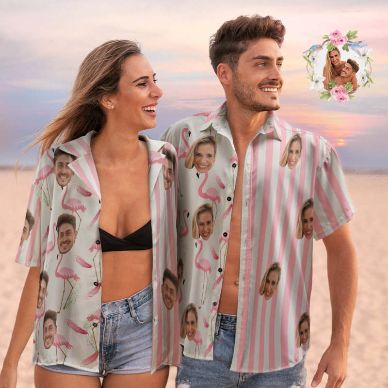 Custom Face Hawaiian Shirts Personalized Couple Flamingo Shirts Casual Short Sleeve Valentine's Day Gift