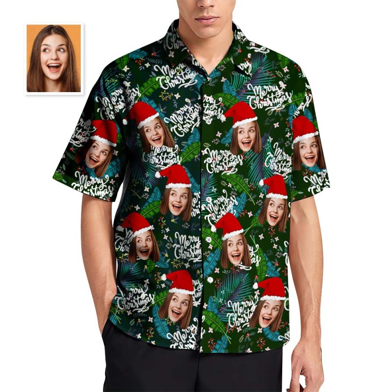 Custom Face Hawaiian Shirts Personalized Photo Gift Men's Christmas Shirts Flower and Leaves