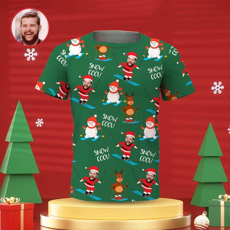 Custom Face Men's T-shirt Personalized Photo Green Santa T-shirt - Snow Cool