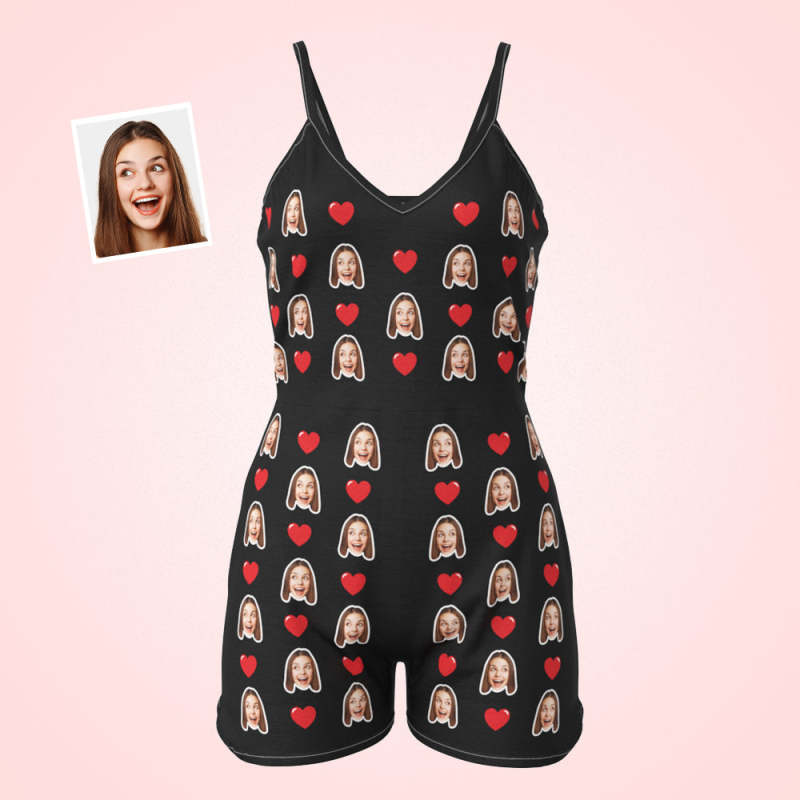 Custom Face Sling Jumpsuit Shorts Personalized Photo Love Heart Sleeveless Pajama For Women