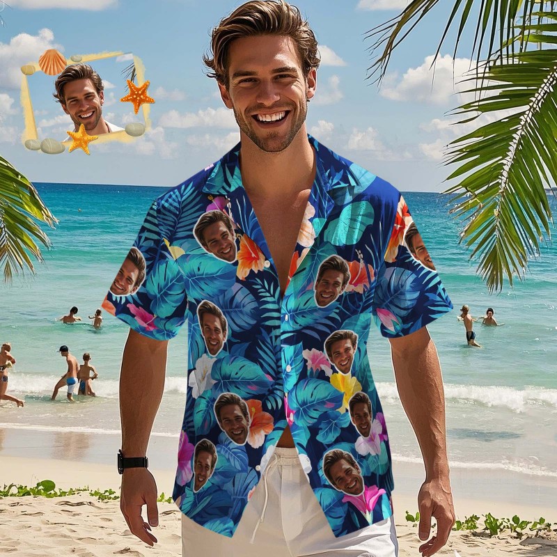Custom Hawaiian Shirt Blue leaf Pattern Colorful Custom Face Hawaiian Shirt