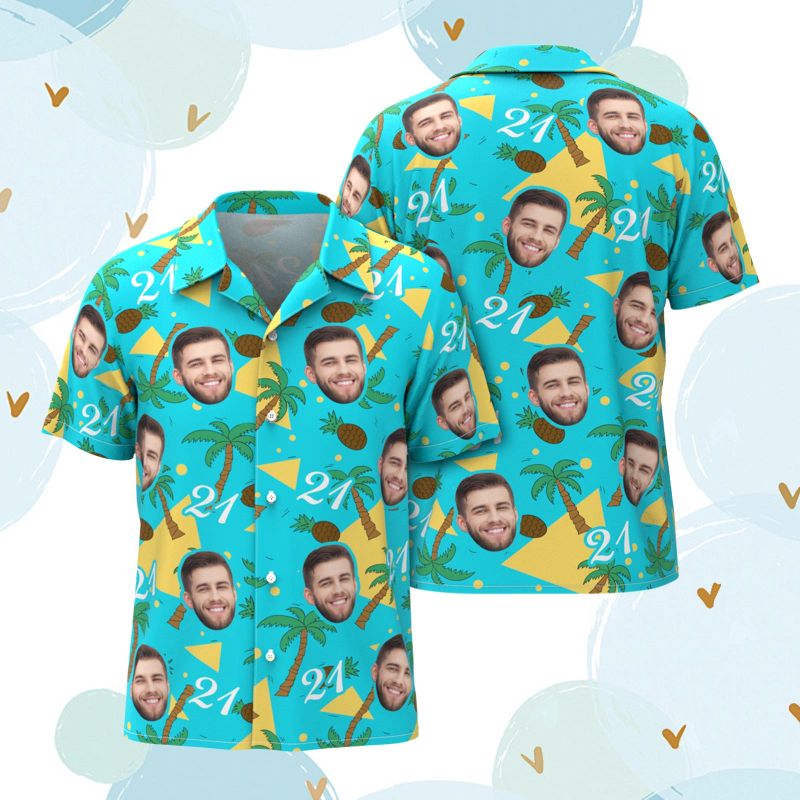 Custom Multi-color Face and Numbers Hawaiian Shirt Coconut Tree and Pineapple Gift for Men