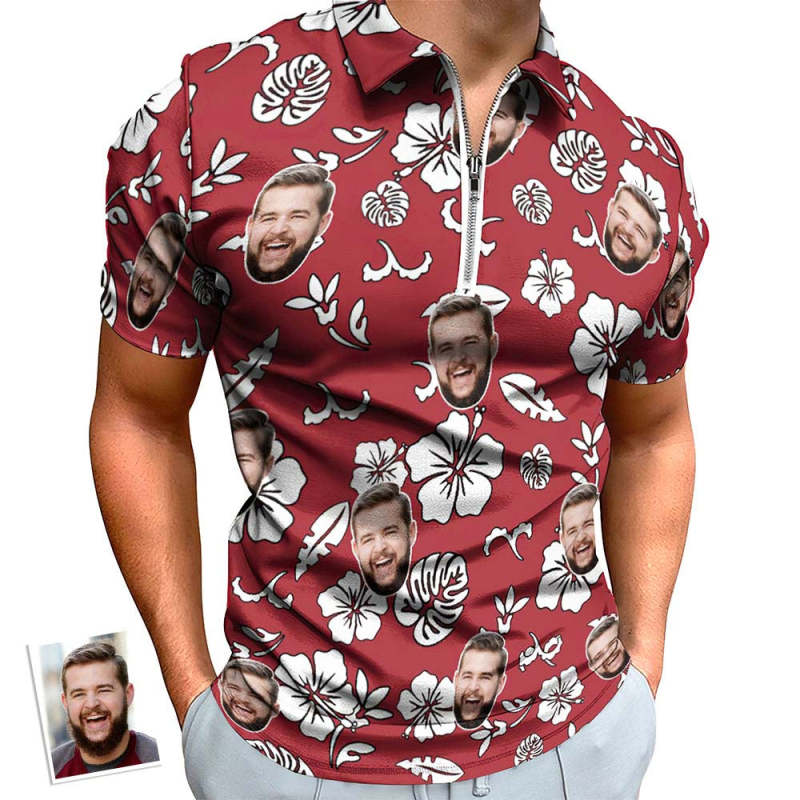 Custom Red Flowers Men's Polo Shirt Personalized Face Funny Polo Shirt with Zipper