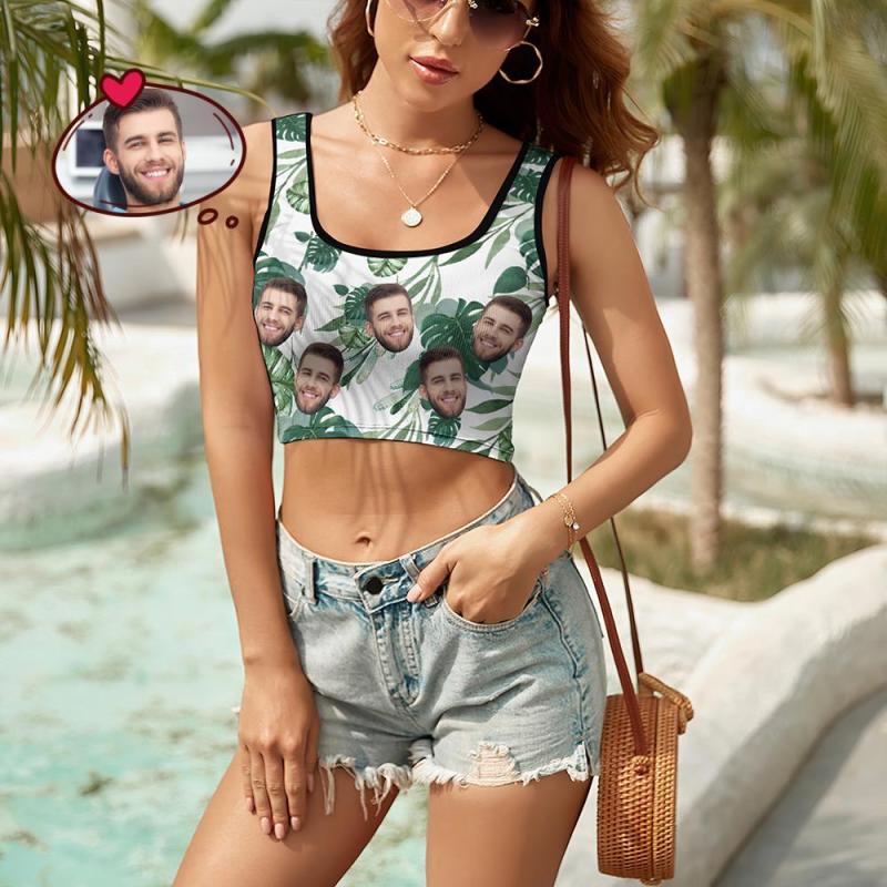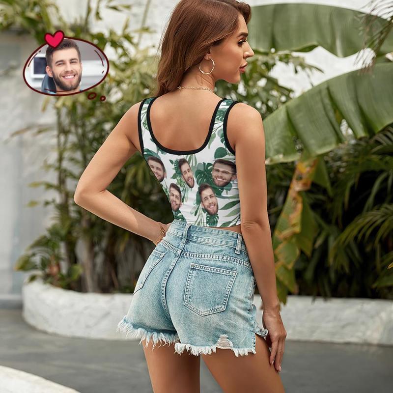 Custom Women's Photo Short Vest Personalised Face Tank Top Crop Top - Green Leaves